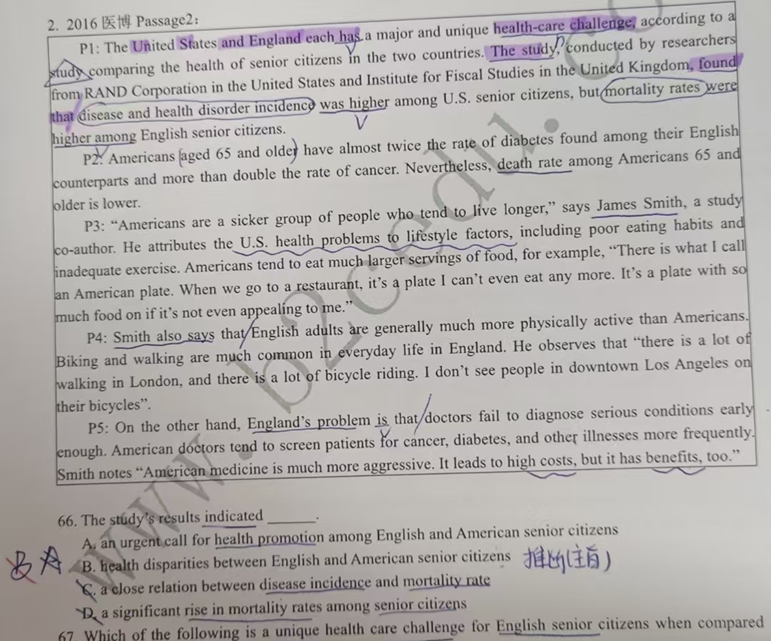 老师解答:题干问的是“the study's results表明了什么?”根据原文第一句话的challenge这个词,还有结合排除法一起来确定答案选A。B选项只是the study's results的内容,且说得也不具体,没有突出健康问题这个层面。
